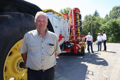 Planteavler John Rasmussen er glad for sin nye Pöttinger-såmaskine.